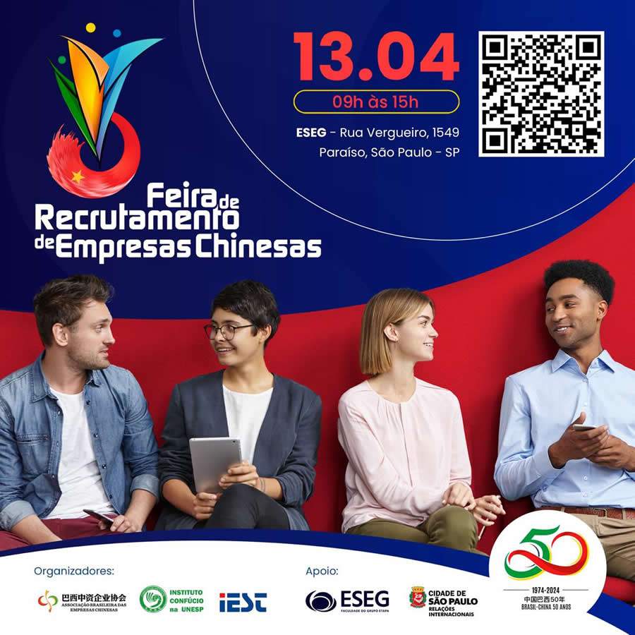 Mais de 300 vagas de trabalho serão oferecidas neste sábado, 13 de abril, na VI Feira de Recrutamento das Empresas Chinesas que acontece nas instalações da ESEG – Faculdade do Grupo Etapa. Gratuita e aberta ao público, a feira é promovida pela Associação Brasileira de Empresas Chinesas (ABEC), o Instituto Confúcio na UNESP e a IEST Group, pioneiros na conexão de talentos brasileiros com empresas chinesas.
