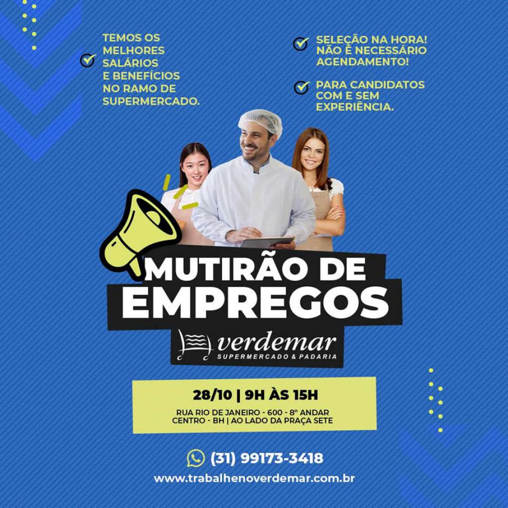 O Verdemar, uma das maiores redes de supermercado de Minas Gerais, está com mais de 500 oportunidades de trabalho para diferentes áreas. Além dos recrutamentos diários, que acontecem de segunda à sexta-feira, das 8h às 17h, na rua Rio de Janeiro, número 600, 8º andar, no Centro de Belo Horizonte, próximo à Praça Sete, a rede realizará um mutirão de empregos no próximo dia 28 de outubro.