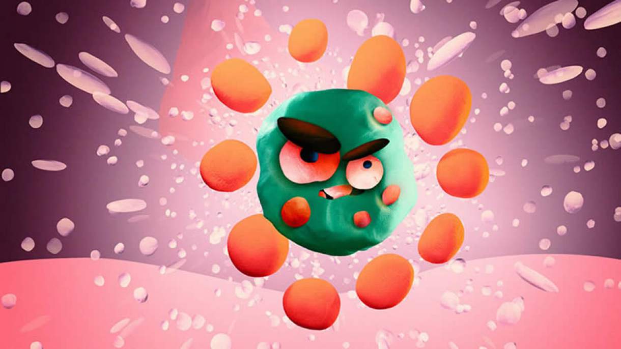 Os terríveis coronavírus tentando ultrapassar a máscara, na animação “O Menino da Máscara Amarela”, criação da médica brasileira Camila Maciel, pesquisadora do MIT e da Universidade de Boston. Ilustração: Gabriel Bitar/CriatividadeX.