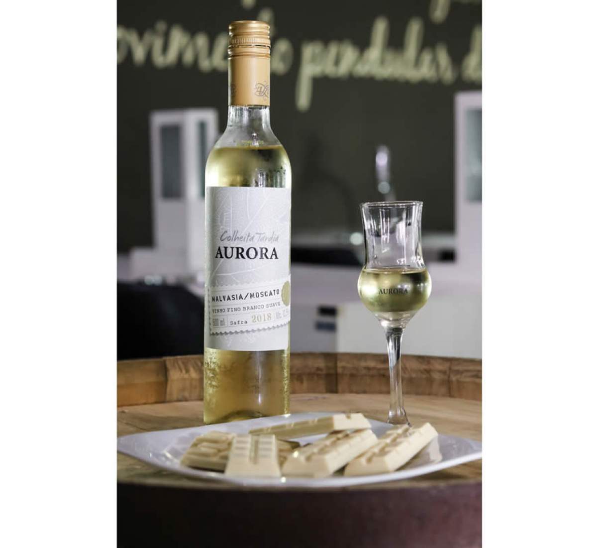Chocolates, especialmente os brancos, harmonizam muito bem com o espumante destaque da Serra Gaúcha, o Moscatel (Aurora Moscatel). Os chocolates brancos também harmonizam perfeitamente com o Aurora Colheita Tardia, com o Aurora Moscatel Rosé ou, até mesmo, com um tinto mais leve e delicado, como o Aurora Varietal Pinot Noir. A combinação também pode ser em forma de contraste, harmonizando este tipo de chocolate com um espumante extra brut, a exemplo do Aurora Pinto Bandeira método tradicional 24 meses.