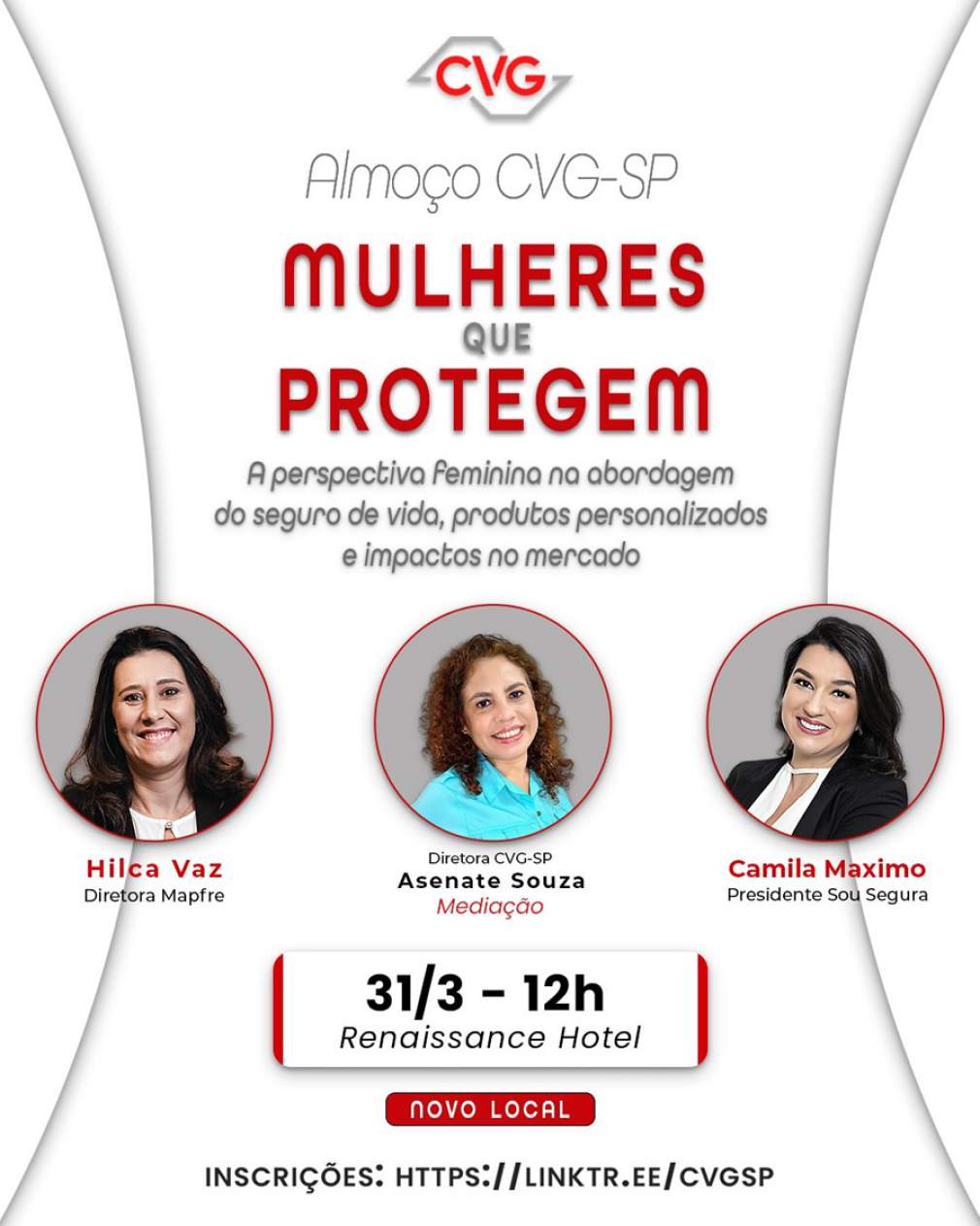 A apresentação do tema “Mulheres que Protegem” contará com a mediação de Asenate Souza, diretora do CVG-SP, e participação de Hilca Vaz, diretora da MAPFRE, e Camila Maximo, presidente da Sou Segura. No formato de talk show, elas analisarão os produtos personalizados do ramo vida e seus impactos no mercado.
