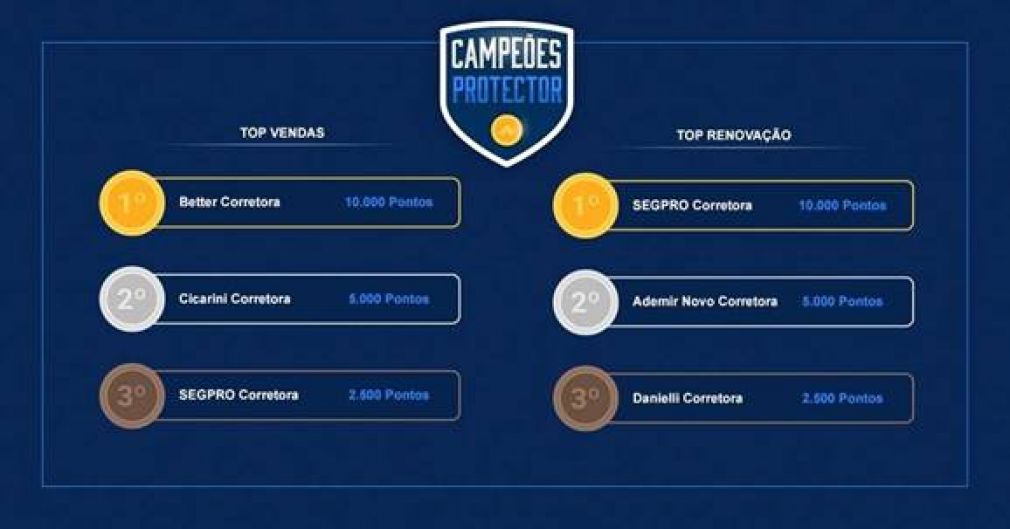 No Top Vendas, o primeiro lugar ficou com a Better Corretora, acompanhada pela Cicarini e SegPro, em segundo e terceiro lugar, respectivamente. Já o Top Renovação apresentou a SegPro na liderança, seguida pela Ademir Novo Corretora e Danielli Corretora. Em ambos os casos, o primeiro lugar recebeu 10 mil pontos, o segundo ficou com 5 mil pontos e o terceiro com 2,5 mil pontos.