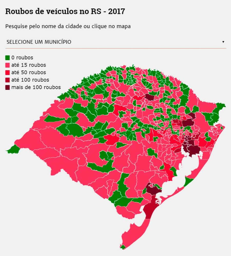 As três cidades que registraram maior número de casos em 2017 foram Porto Alegre, com 8.430 registros, Canoas com 1.002 e Viamão com 969 registros. Dessas cidades, Viamão apresentou um índice de aproximadamente dois veículos roubados a cada dia, enquanto os outros dois possuem três casos, representando um roubo a cada oito horas.
