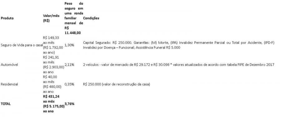 De acordo com os cálculos, (veja tabela abaixo), o casal exemplificado investe aproximadamente 3,76% de sua renda mensal para proteger o patrimônio de sua família com a contratação dos seguintes tipos de apólices: seguro de vida para ambos, seguro automóvel para dois veículos e seguro residencial.