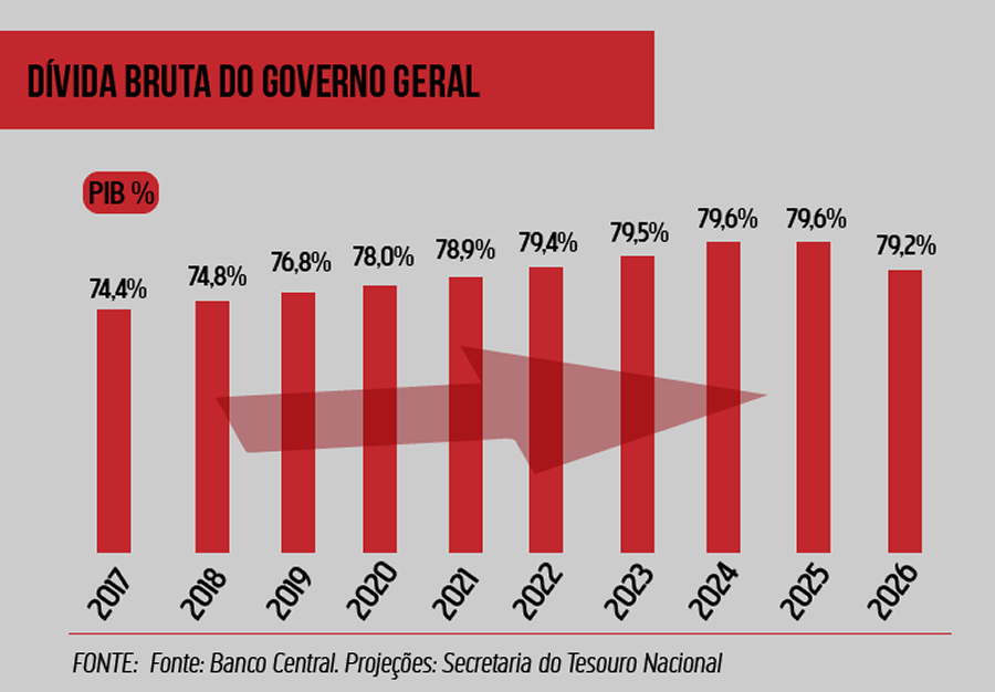 O Tesouro Nacional divulgou na última semana que a projeção do crescimento da dívida gerada pelo setor público pode atingir, até 2026, 80% do Produto Interno Bruto (PIB) brasileiro. Para 2018, a estimativa é que a porcentagem atinja a marca de 74,8%. As informações foram publicadas no Plano Anual de Financiamento (PAF) da dívida pública.