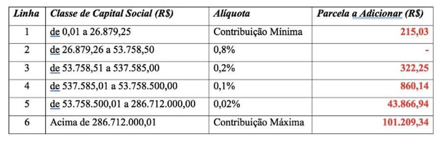 A contribuição anual será cobrada de acordo com o capital social registrado no contrato social de cada empresa corretora, conforme tabela a seguir.