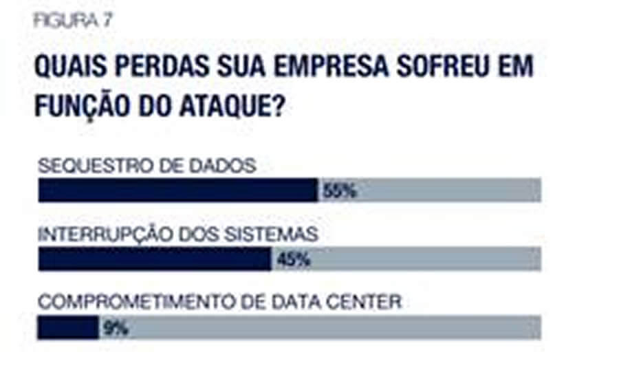 Cerca de 1/4 dos entrevistados relataram que suas empresas já foram vítimas de um ataque virtual. Destes, 55% informaram que a principal consequência foi o sequestro de dados, seguido pela interrupção dos sistemas (45%). As empresas informaram que as perdas em função dessas invasões variaram entre R$ 25 mil e R$ 500 mil.
