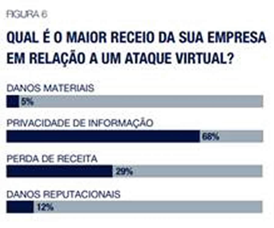 A maior preocupação dos executivos de grandes empresas brasileiras é a quebra de privacidade da informação de seus clientes, aponta pesquisa da gestora de riscos e corretora de seguros, JLT Brasil. Mais da metade dos entrevistados (68%) afirmaram que este é o maior receio no caso de um ataque cibernético. Na sequência aparecem perda de receita, danos à reputação e danos materiais.