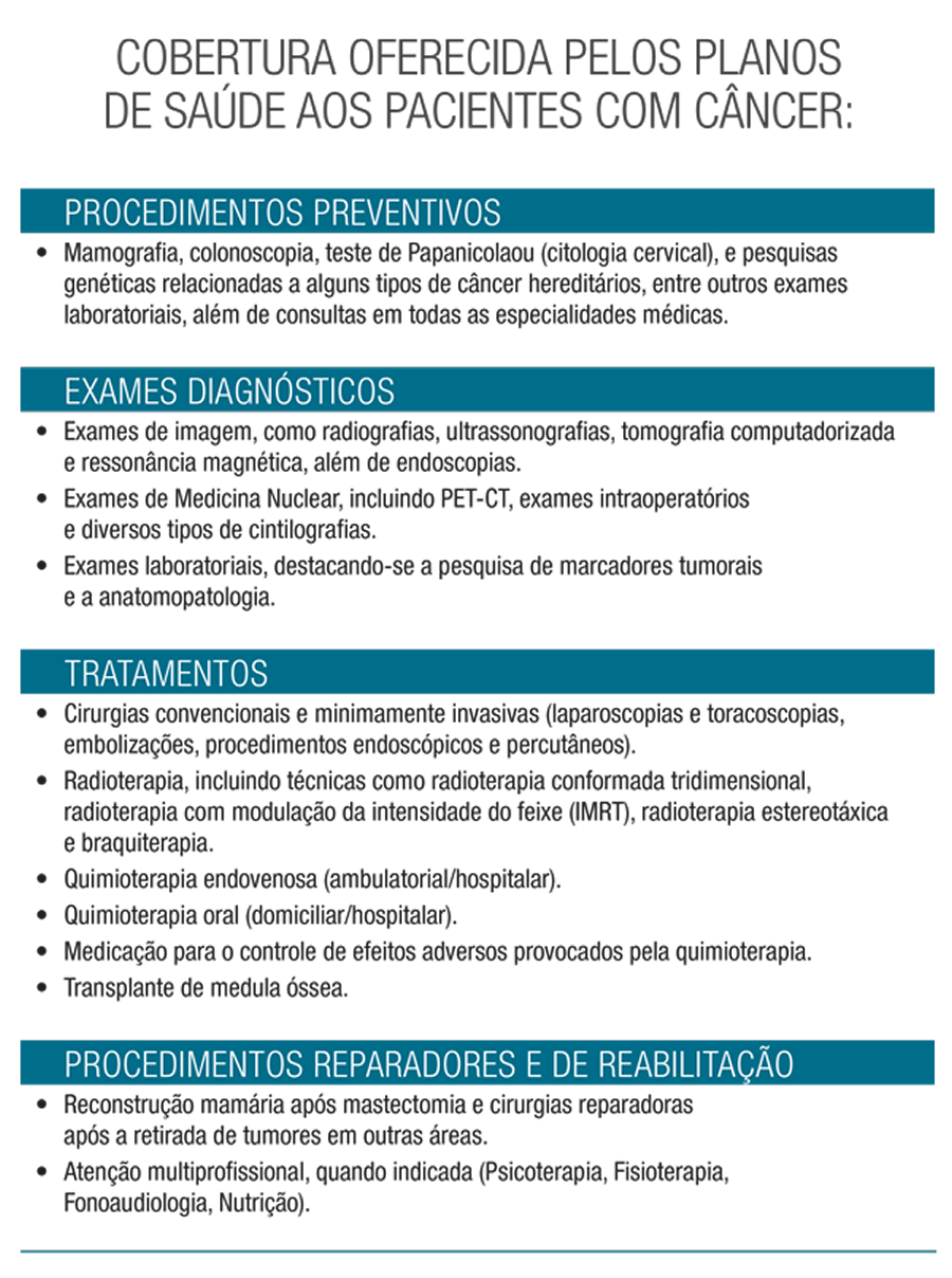 Para verificar a lista de procedimentos obrigatórios cobertos pelos planos de saúde, incluindo os procedimentos oncológicos, acesse aqui o Rol de Procedimentos da ANS.