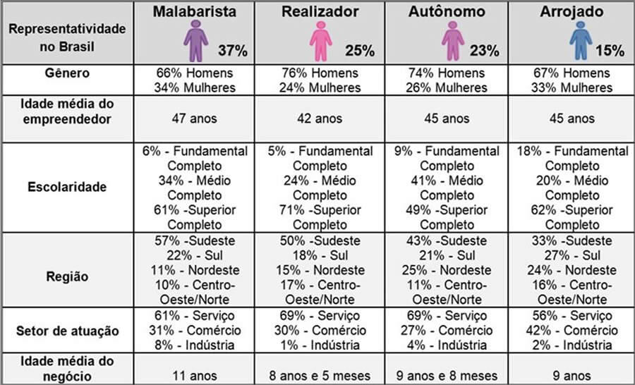 A maioria possui microempresa. Esses empresários também se caracterizam pelo otimismo ao enfrentar dificuldades. São receosos quando o assunto é o uso da tecnologia e procuram correr poucos riscos, inclusive na busca por crédito, procurando taxas e prazos melhores. Para os microempreendedores enquadrados aqui, a motivação reside na qualidade da entrega do serviço/produto. Para atender bem, sacrificam o tempo e até relaxam nas outras atividades do dia a dia. O desafio é terminar o mês no azul e começar o outro um pouco melhor.