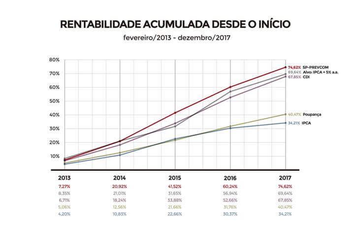 O retorno dos investimentos manteve-se em alta no acumulado de 2013 a 2017. Os recursos dos planos renderam 74,62%, acima da meta de IPCA mais 5% que ficou em 69,64% e dos 67,85% do CDI neste mesmo intervalo de tempo. O ganho obtido pela Fundação superou os 40,58% das aplicações em poupança e a inflação de 34,21%.