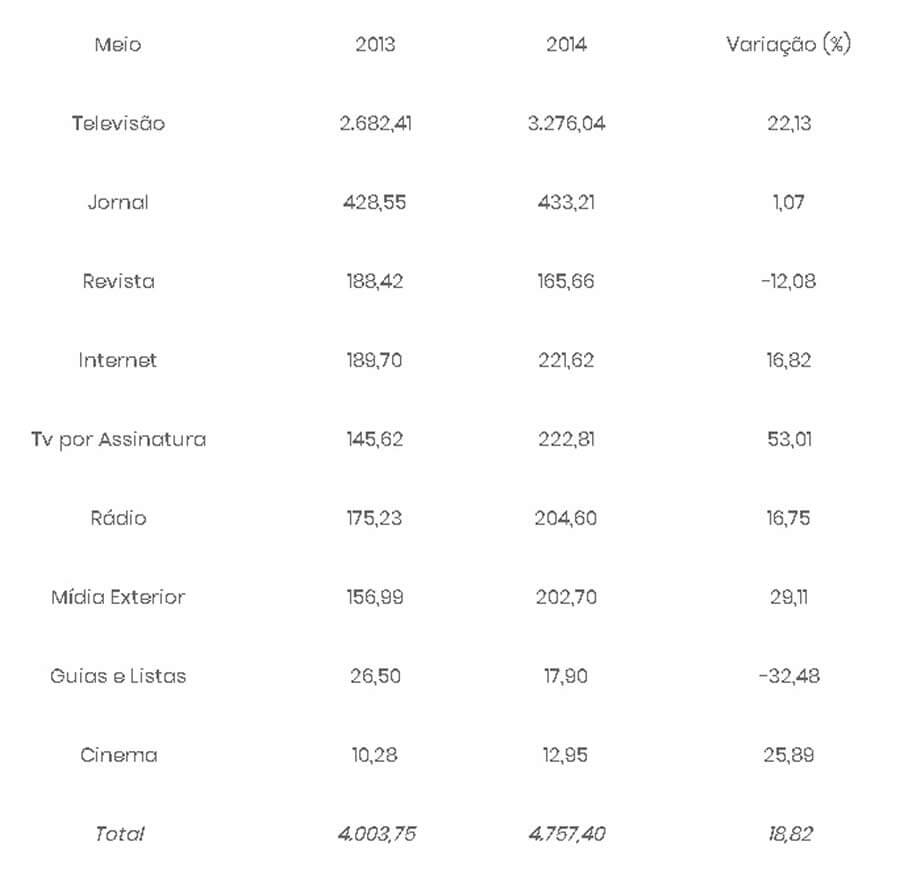 *Faturamento dos meios em Milhões (R$) - Fonte: Projeto Inter-Meios - 1 BIM - 2014