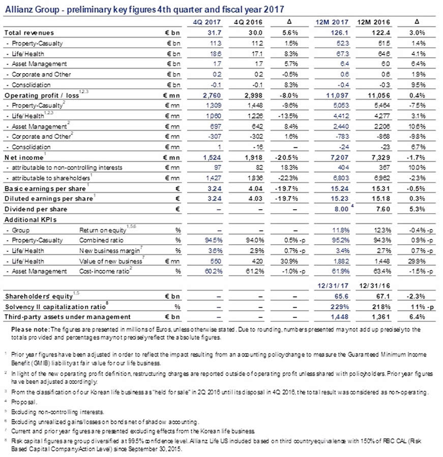 O Grupo Allianz registrou resultados expressivos em 2017 devido em grande parte ao melhor desempenho em Gestão de Ativos e no ramo Vida e Saúde. A receita total do Grupo subiu 3% e atingiu 126,1 bilhões de euros (122,4 bi em 2016) para o ano todo, impulsionada por melhorias em todos os segmentos de negócio. O lucro operacional subiu mais 0,4 % chegando em 11,1 bilhões de euros em 2017 (11,1 bi em 2016), situada na faixa visada pelo Grupo, entre 10,3 a 11,3 bilhões de euros. O segmento Property & Casualty viu o lucro operacional cair 7,5 % devido, principalmente, às indenizações maiores por catástrofes naturais ocorridas em 2017, o ano mais caro de todos os tempos para o setor de Seguros. Os sinistros por conta dos incêndios florestais na Califórnia, dos furacões Harvey, Irma e Maria, além das tempestades na Europa e outras catástrofes naturais, se elevaram a 1,1 bilhão de euros – contra 0,7 bi em 2016. O rendimento líquido atribuível aos acionistas encolheu 2,3%, ficando em 6,8 bilhões (contra 6,96) em 2017, por influência do impacto pontual das mudanças fiscais nos EUA e dos efeitos derivados da venda do Oldenburgische Landesbank (OLB).