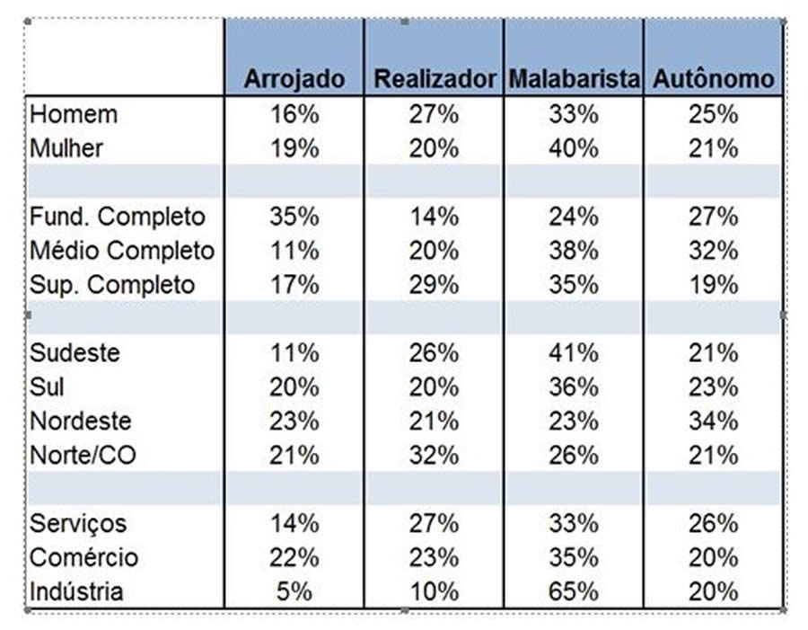 Uma pesquisa inédita realizada em 2017 pela Serasa Experian descobriu as características e aspectos demográficos dos quatro perfis de microempreendedores mais dominantes no Brasil – Malabarista, Realizador, Autônomo e Arrojado. Segundo o levantamento, as mulheres estão mais concentradas no “Malabarista” – pessoas que sabem que o dia a dia é a verdadeira escola de “como empreender” e contornam as dificuldades com muito otimismo –, chegando a 40% do total. Os homens também predominam no mesmo grupo, porém, com menor intensidade (33%).