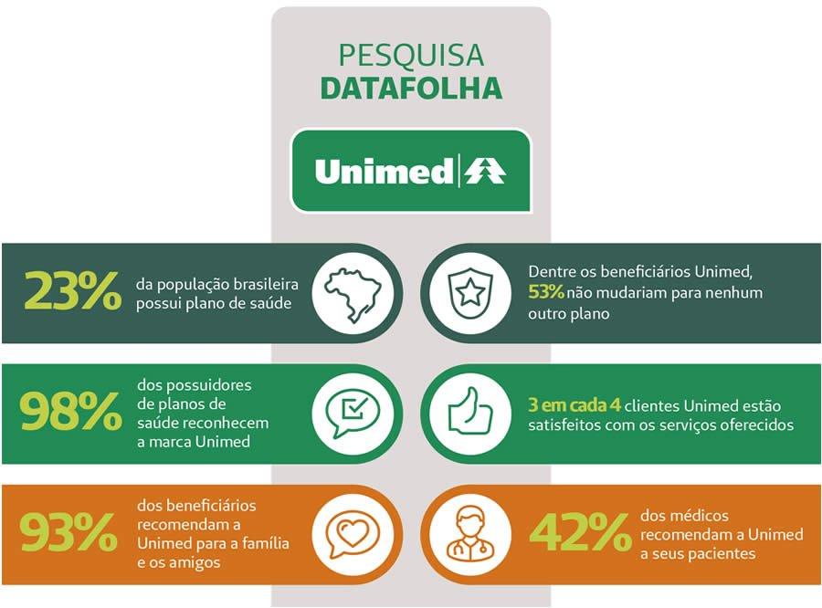 Outro estudo do Instituto Datafolha, também desenvolvido a pedido da Unimed do Brasil, avaliou a relação dos médicos com a marca Unimed. De acordo com a pesquisa, realizada por telefone, caso solicitado, 42% dos médicos recomendariam Unimed a seus pacientes. A pesquisa nacional, realizada entre julho e setembro de 2017, contemplou 1.110 entrevistas com médicos – incluindo 550 cooperados Unimed.