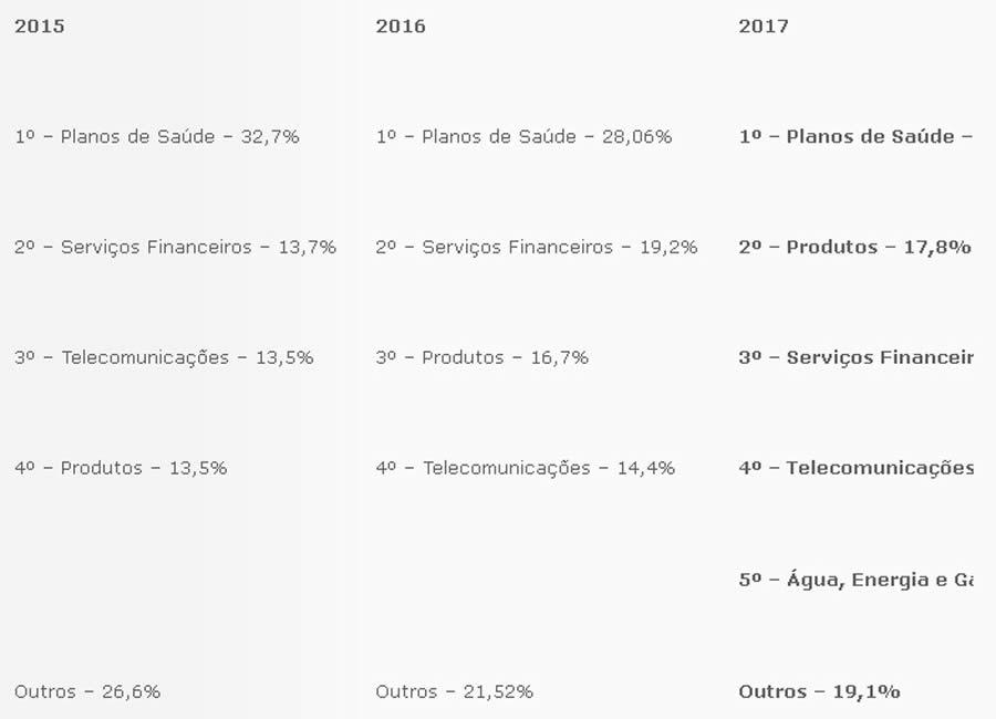 Em 2017, as dúvidas e queixas sobre telefonia móvel e fixa, TV por assinatura e internet ficaram com a quarta posição, com 15,8%. Apesar de ter se mantido na mesma posição de 2016 , o percentual de 2017 é o maior registrado pela área desde 2010. TV por assinatura, seguidos por problemas com telefonia e internet foram os temas mais questionados.