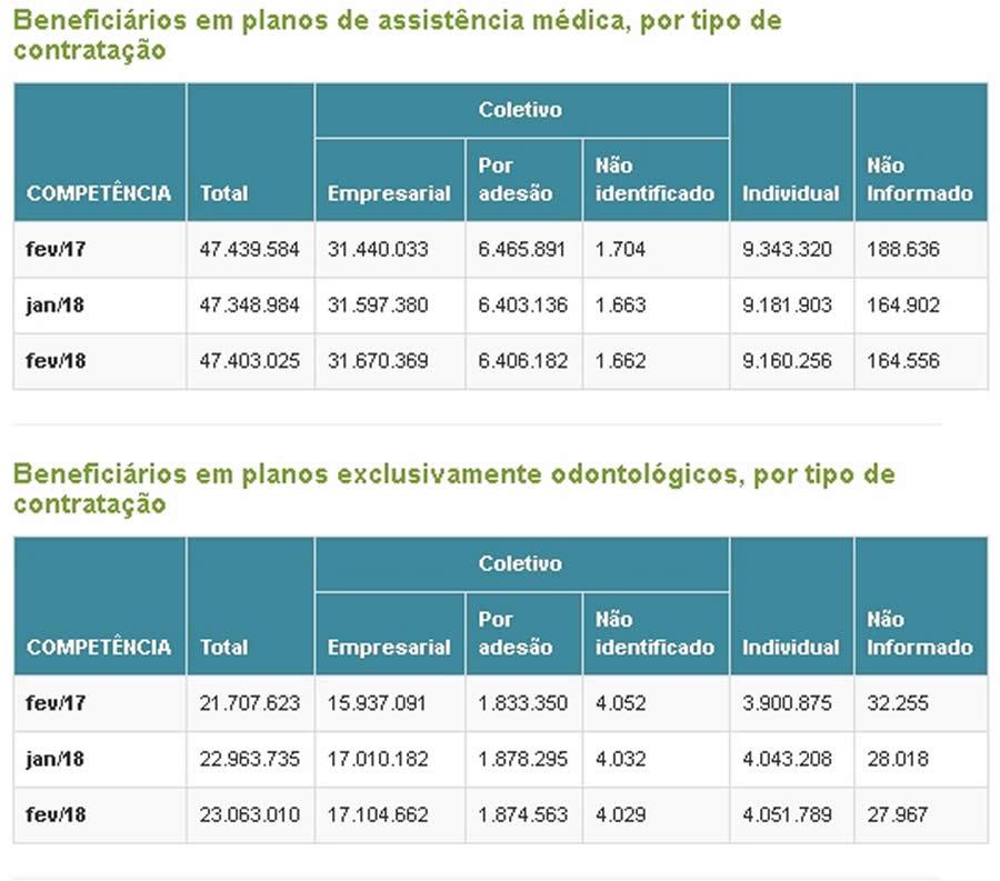 A Agência Nacional de Saúde Suplementar (ANS) atualizou nesta quarta-feira (21/03) os dados do setor de planos de saúde - disponibilizados para consulta de forma permanente na Sala de Situação no portal da Agência. Os números relativos a fevereiro confirmam a tendência de estabilidade que vem sendo observada nos últimos meses: são 47,4 milhões de beneficiários em planos médico-hospitalares, 54.041 mil a mais que o número registrado em janeiro. No comparativo anual houve queda: 36.559 beneficiários a menos em relação a fevereiro de 2017.