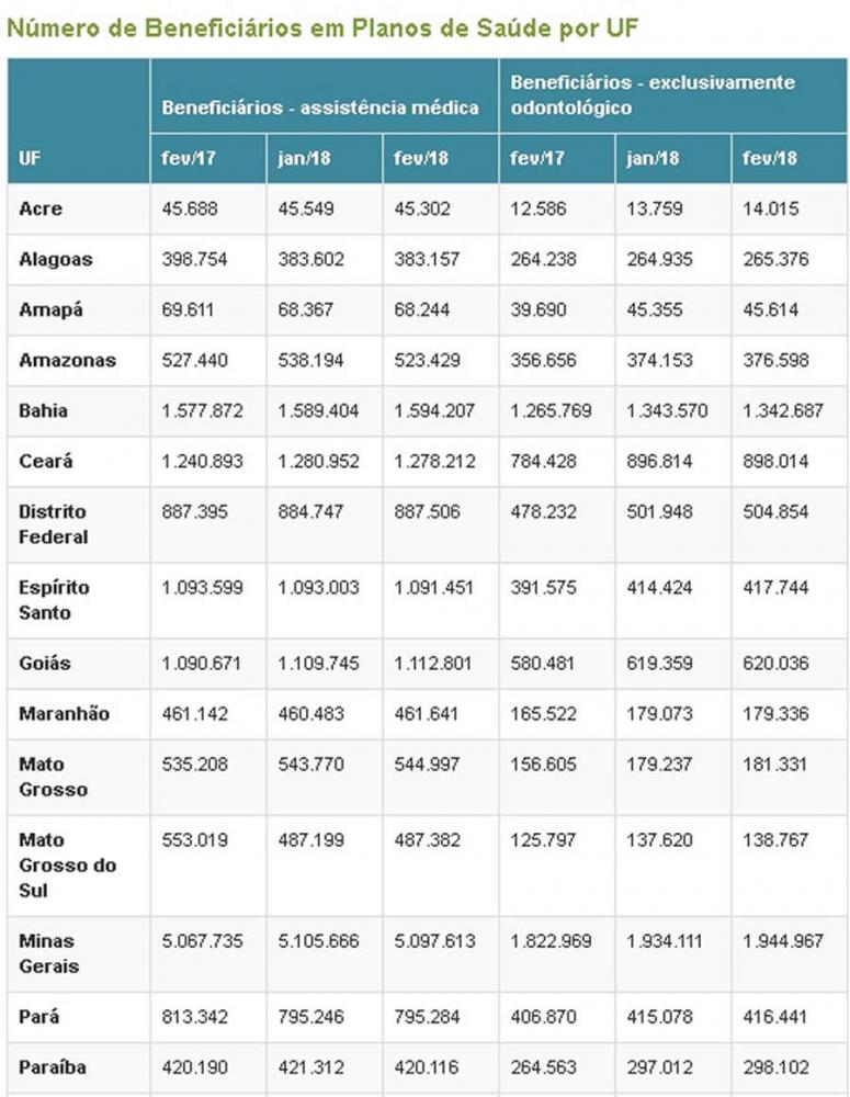 No último ano, houve aumento de beneficiários em planos de assistência médica em 13 estados: Bahia, Ceará, Distrito Federal, Goiás, Maranhão, Mato Grosso, Minas Gerais, Paraná, Piauí, Rio Grande do Norte, Rio Grande do Sul, Santa Catarina e Sergipe. Cabe destacar que, à exceção do Rio Grande do Sul, os demais estados também apresentaram crescimento no comparativo entre janeiro de 2017 e janeiro de 2018.