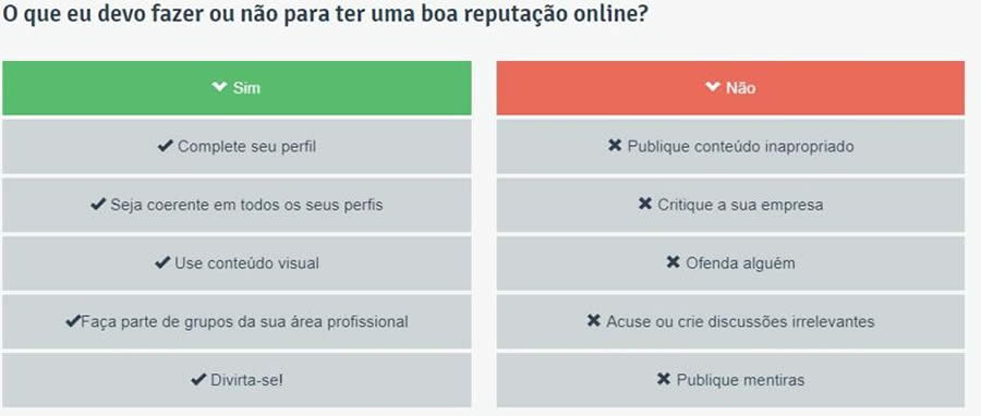 Para começar, tudo o que o profissional precisa fazer é uma pequena mudança nos seus perfis. “Esta revisão pode ser feita de modo rápido e dinâmico, ou seja, em pouquíssimo tempo, e a presença nas redes sociais será ampliada. É preciso olhar de modo crítico para as informações compartilhadas e analisar se o conteúdo é favorável/coerente com o seu discurso profissional, se é favorável a novos negócios ou se, no mínimo, é agradável em uma leitura livre, por exemplo, dentro de uma sala de reunião ou processo de recrutamento. Mas para que o processo seja efetivo, é importante repeti-lo e melhorá-lo a cada seis meses”, afirma Roberto Picino.