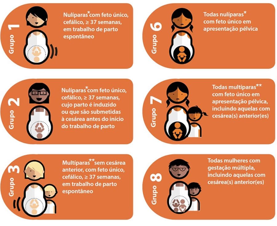 A metodologia aplicada na Fase 2 para escolher a população alvo de gestantes a serem atendidas baseou-se na Classificação de Robson*, que foi recomendada em 2011 pela Organização Mundial de Saúde (OMS) como sistema de classificação de cesáreas. A classificação categoriza as gestantes em 10 grupos criados a partir de cinco características obstétricas que são colhidas em todas as maternidades: