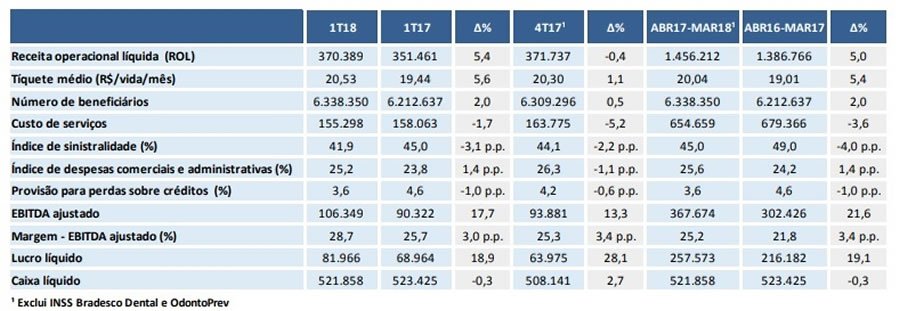 O lucro líquido foi de R$82 milhões, 18,9% superior ao observado no 1T17. A OdontoPrev registrou em 31 de março caixa líquido de R$522 milhões, sem nenhuma dívida.