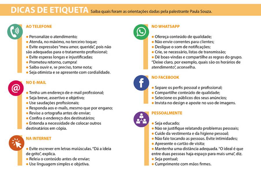 “A etiqueta empresarial é um código de comportamento. O uso dela se faz necessário para dar harmonia às relações, pois o que é de bom senso pra mim, pode não ser para outra pessoa”, afirma Paula. Na ocasião, ela elencou algumas dicas direcionadas aos profissionais em diferentes ocasiões (veja mais abaixo).