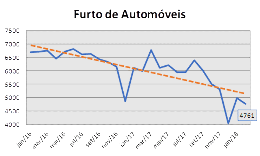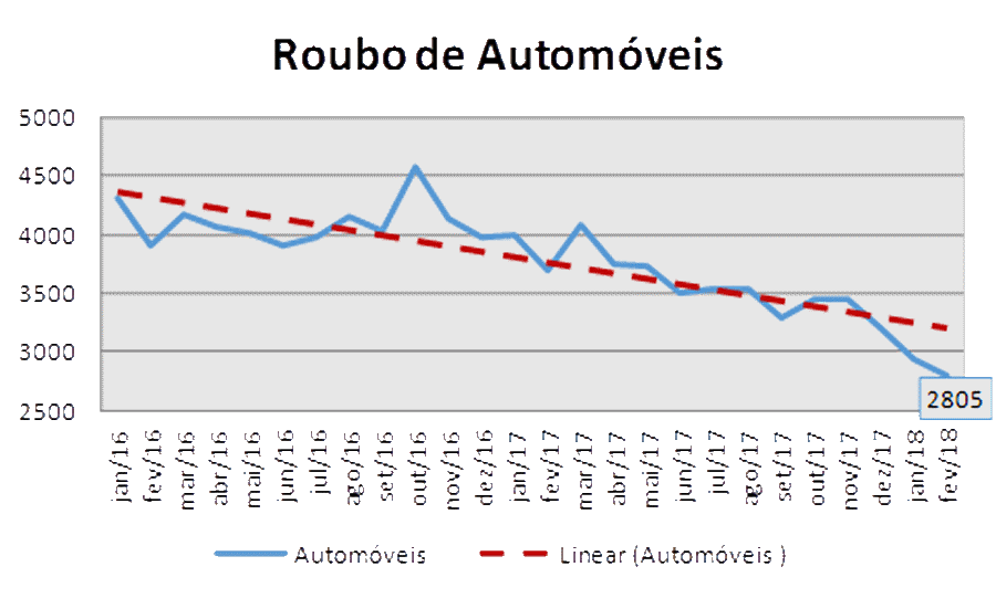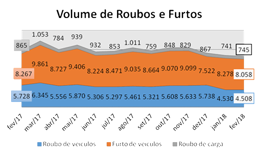Em fevereiro de 2018 foram notificados 4508 roubos e 8058 furtos. Já no mesmo mês do ano anterior foram 5728 roubos e 8267 furtos, ou seja, queda de 3% e 21%, respectivamente. Já os casos envolvendo cargas tiveram queda de 14%. A cada hora, uma carga é roubada; pelo menos 11 veículos são furtados e outros 7 roubados, no Estado.