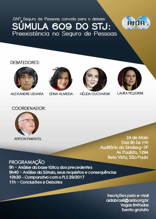 No dia 24 de Maio, o GNT da AIDA Brasil de Seguro de Pessoas promoverá um debate para discutir a Súmula 609 do STJ, que trata sobre a recusa de cobertura securitária, sob a alegação de doença preexistente.