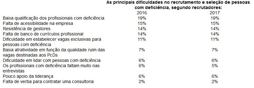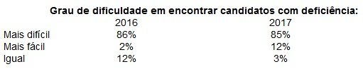 Foram entrevistadas 1.091, entre pessoas que possuem algum tipo de deficiência ou mobilidade reduzida, 117 executivos e 1.240 recrutadores. O levantamento foi realizado entre julho e setembro de 2017.