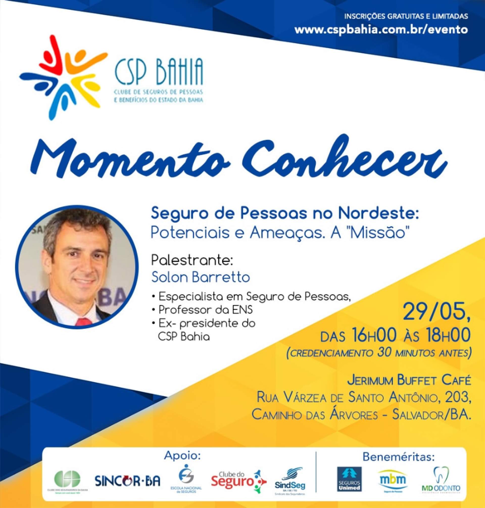 Em continuidade aos trabalhos de qualificação dos profissionais do mercado de seguros baiano que atuam nos ramos de Vida e Benefícios, o CSP-Bahia promove na próxima terça-feira (29) mais uma edição do Momento Conhecer. O evento contará com a apresentação da MBM Seguros como a mais nova benemérita da entidade, e trará uma palestra sobre Seguro de Pessoas.