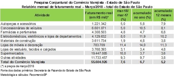 Em março, as vendas do comércio varejista no Estado de São Paulo cresceram 7,6%, em termos reais, em relação ao mesmo mês de 2017 e atingiram R$ 55,6 bilhões, montante R$ 3,9 bilhões superior ao apresentado um ano antes. É o maior faturamento para um mês de março desde o início da série histórica, em 2008. Com esses resultados, a variação acumulada no primeiro trimestre de 2018 foi de 6,7%, que representa um aumento de R$ 9,9 bilhões nas receitas em comparação ao mesmo período de 2017, já descontada a inflação.