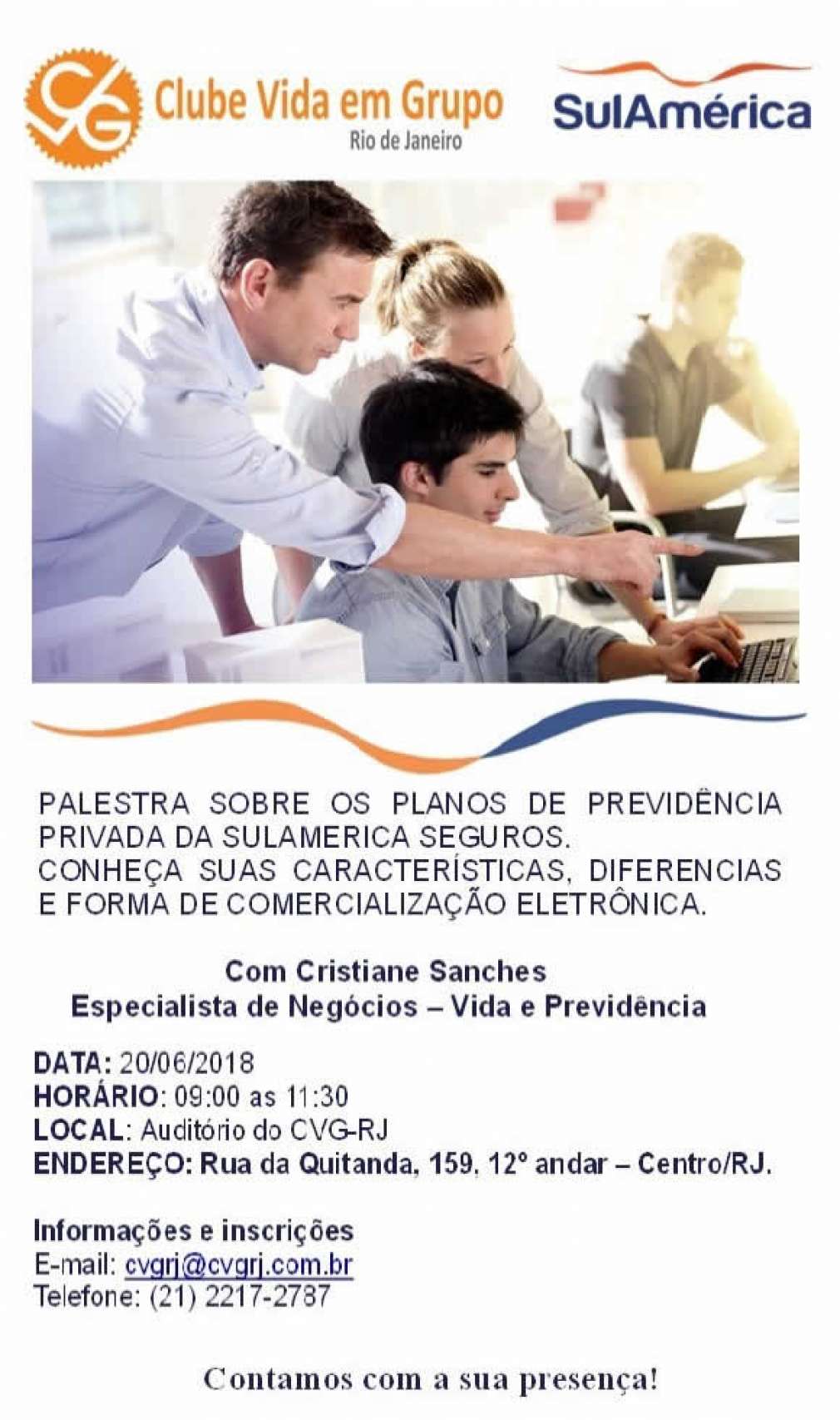 A especialista de negócios de Vida e Previdência da SulAmérica, Cristiane Sanches, vai realizar uma palestra na sede do Clube Vida em Grupo do Rio de Janeiro (CVG-RJ) no próximo dia 20 de junho.