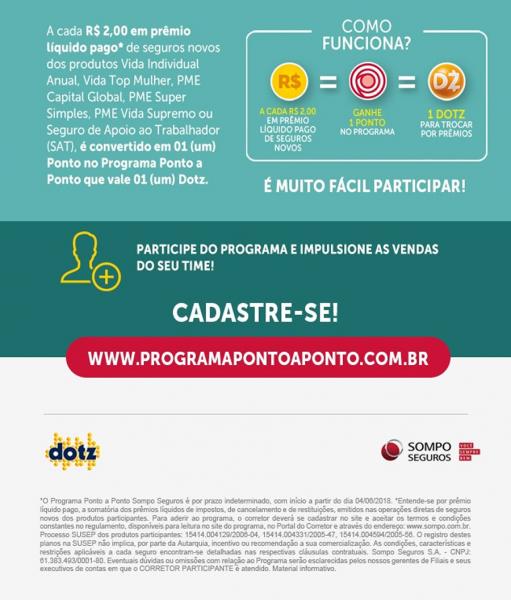 Por meio da iniciativa, os corretores de seguros cadastrados e ativos na Sompo Seguros que comercializarem os produtos Vida Individual Anual, Vida Top Mulher, PME Capital Global, Seguro de Apoio ao Trabalhador (SAT), PME Super Simples e PME Vida Supremo; vão acumular pontos que poderão ser trocados por prêmios. São mais de 50 mil itens, como produtos, viagens e experiências disponíveis no Catálogo Dotz. As trocas podem ser efetuadas online, via App Dotz, em parceiros físicos ou pela Central de Atendimento Dotz.