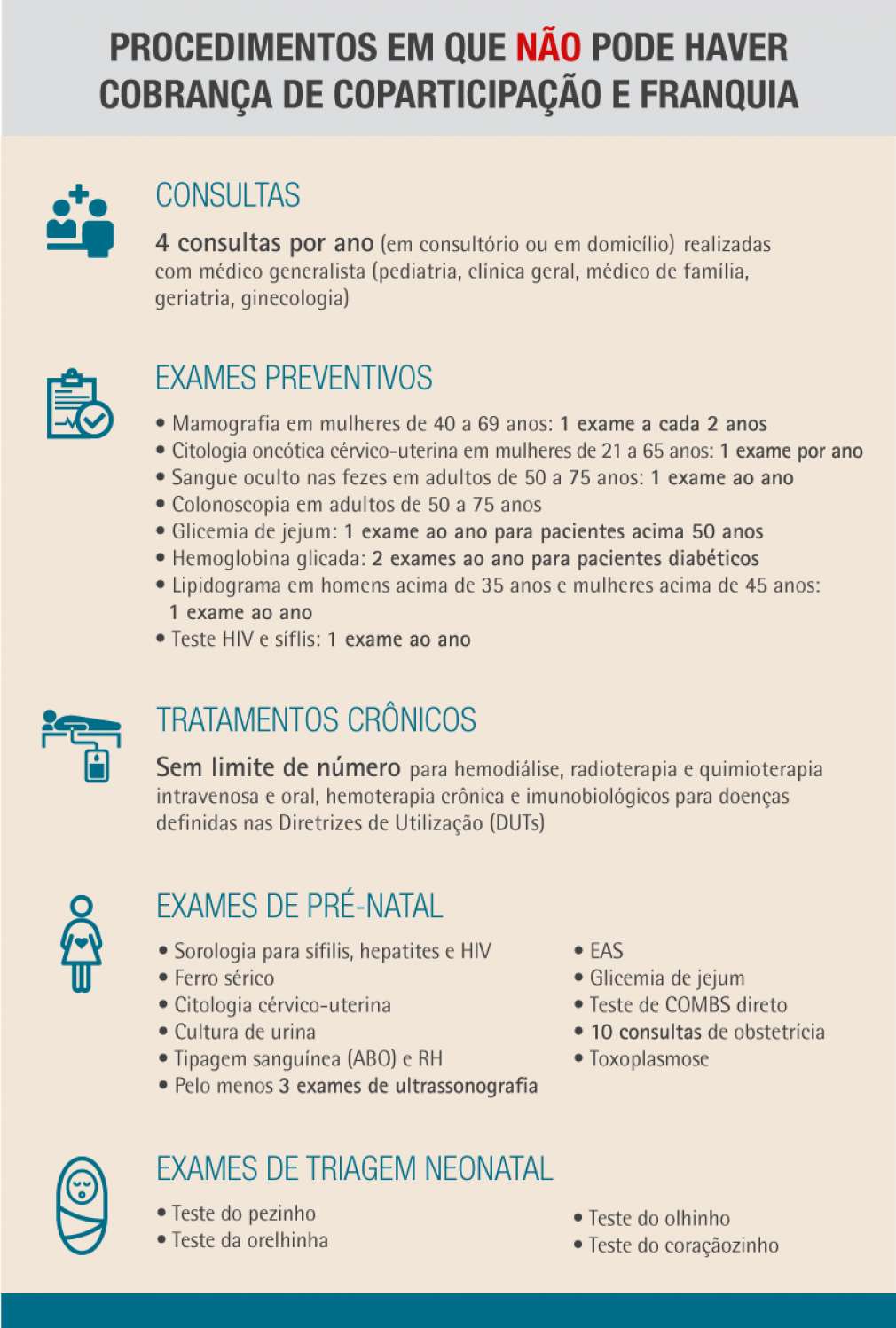 As novas regras também preveem isenção de cobrança de coparticipação e franquia em mais de 250 procedimentos e eventos em saúde, tais como: consultas com médico generalista, exames preventivos e de pré-natal e tratamentos crônicos, incluindo os pacientes com câncer e com problemas renais. Atualmente, os mecanismos incidem em qualquer procedimento. Com o estabelecimento de isenções, a ANS busca incentivar o adequado cuidado à saúde. Veja abaixo os procedimentos que não poderão ter cobrança de coparticipação e franquia: