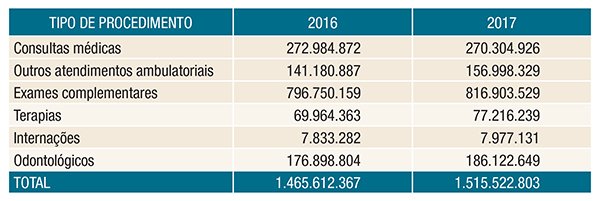 Está disponível a sexta edição do Mapa Assistencial da Saúde Suplementar, publicação elaborada pela Agência Nacional de Saúde Suplementar (ANS) que traz os dados sobre procedimentos realizados pelos beneficiários de planos de saúde. Em 2017, o setor contabilizou mais de 1,51 bilhão de consultas médicas, outros atendimentos ambulatoriais, exames, terapias, internações e procedimentos odontológicos. O número representa um aumento de 3,4% em relação à produção assistencial registrada em 2016 (em números absolutos), ano em que o setor totalizou 1,46 bilhão de procedimentos efetuados.