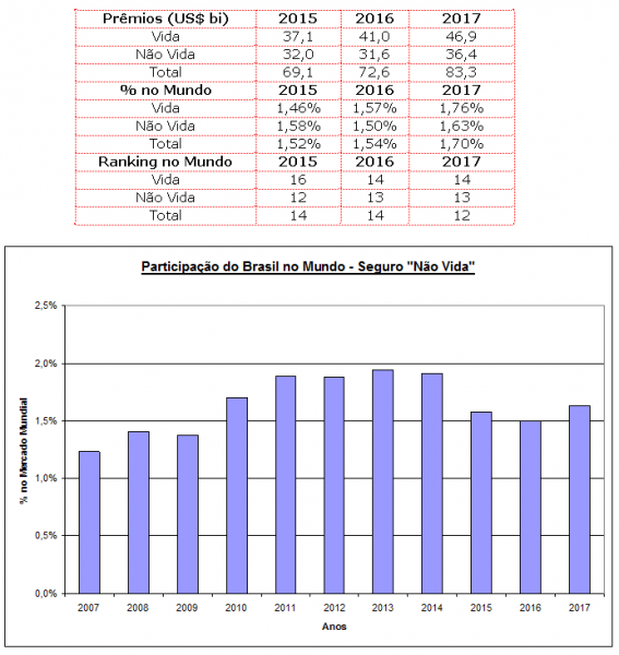 3) No total, as participações do Brasil - em 2015, 2016 e 2017 – foram, respectivamente, 1,52%, 1,54% e 1,70% do mercado segurador mundial. Isto é, apesar das dificuldades, houve crescimento no período em questão. Atualmente, o país ocupa a 12ª posição geral no mercado segurador mundial.