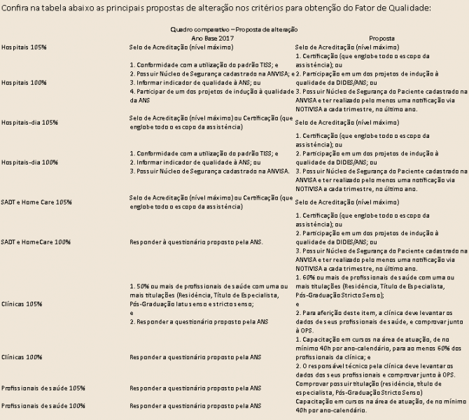 O Fator de Qualidade é aplicado ao índice de reajuste estabelecido pela ANS nos contratos entre operadoras de planos de saúde e prestadores de serviço (hospitais, clínicas, profissionais de saúde, entre outros). Pela proposta da ANS, o Fator de Qualidade permanece com os percentuais de 105%, 100% ou 85% aplicados ao IPCA. A aplicação, no entanto, exige que as partes cumpram critérios de qualidade pré-estabelecidos. Além disso, deve estar prevista em contrato como única forma de reajuste, mediante livre negociação entre as partes e sem novo acordo nos primeiros 90 dias do ano. Em 2018, 49 mil prestadores de serviço de saúde tiveram a opção de utilizar o Fator de Qualidade.