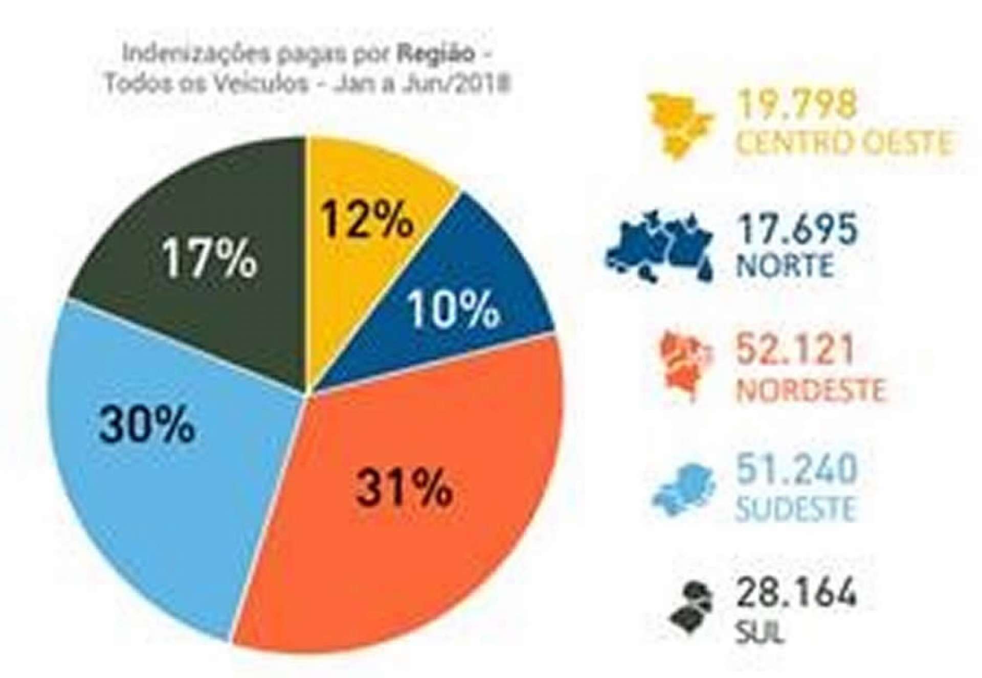 A região Nordeste foi responsável pela maior concentração das indenizações pagas no período (31%), seguida das regiões Sudeste (30%), Sul (17%), Centro-Oeste (12%) e Norte (10%). A região Sudeste representa 49% da frota nacional, enquanto o Nordeste tem apenas 17%, ficando em terceiro lugar na lista com o número total de veículos do país, segundo o Denatran.