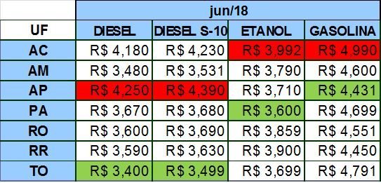 Tocantins registrou os menores valores para o diesel e diesel S-10: R$ 3,40 e R$ 3,49, respectivamente. O diesel mais caro da Região Norte e o mais caro do Brasil foram encontrados no Amapá: R$ 4,25 o diesel comum e R$ 4,39 o litro do S-10.