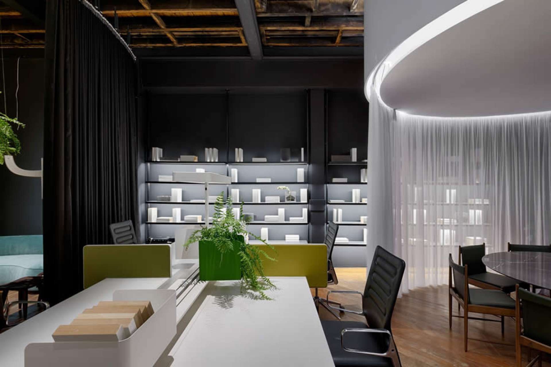 O espaço de trabalho traz prateleiras de fora a fora que evocam a sensação de lar, além de uma linha especial de mobiliário suíço da marca Vitra, assinada pelo arquiteto francês Jean Prouvé. Já a sala de reunião conta com mesa redonda para oito lugares, no mesmo material da recepção, porém com acabamento diferente. Para dar um ar de bossa nova, foram utilizadas cadeiras assinadas por Sergio Rodrigues e mobiliário da São Romão. A cortina de voal branca, com sistema automatizado para abertura e fechamento, proporciona momentos de privacidade para atendimento a clientes.