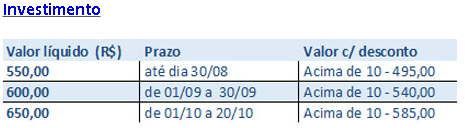 - depósito bancário (dados serão informados somente quando da inscrição)