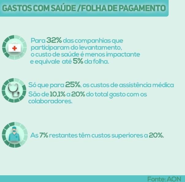 Os custos de cuidados com a saúde dos trabalhadores, na utilização de planos de saúde,se tornaram a segunda maior despesa das empresas, superado apenas pelos custos da folha de pagamento. É o que revela um balanço feito pela consultoria de benefícios e capital humano AON. De acordo com o levantamento, para 36 por cento das empresas analisadas, a assistência médica pode representar de 5a 10 por cento da folha de pagamento.
