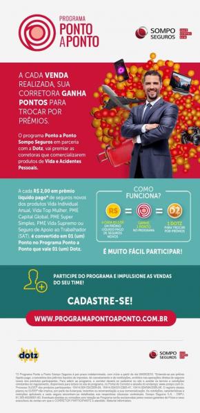 Por meio da iniciativa, os corretores de seguros cadastrados e ativos na Sompo Seguros que comercializarem os produtos Vida Individual Anual, Vida Top Mulher, PME Capital Global, Seguro de Apoio ao Trabalhador (SAT), PME Super Simples e PME Vida Supremo; acumulam pontos que podem ser trocados por prêmios. São mais de 50 mil itens, como produtos, viagens e experiências disponíveis no Catálogo Dotz. As trocas podem ser efetuadas online, via App Dotz, em parceiros físicos ou pela Central de Atendimento Dotz.