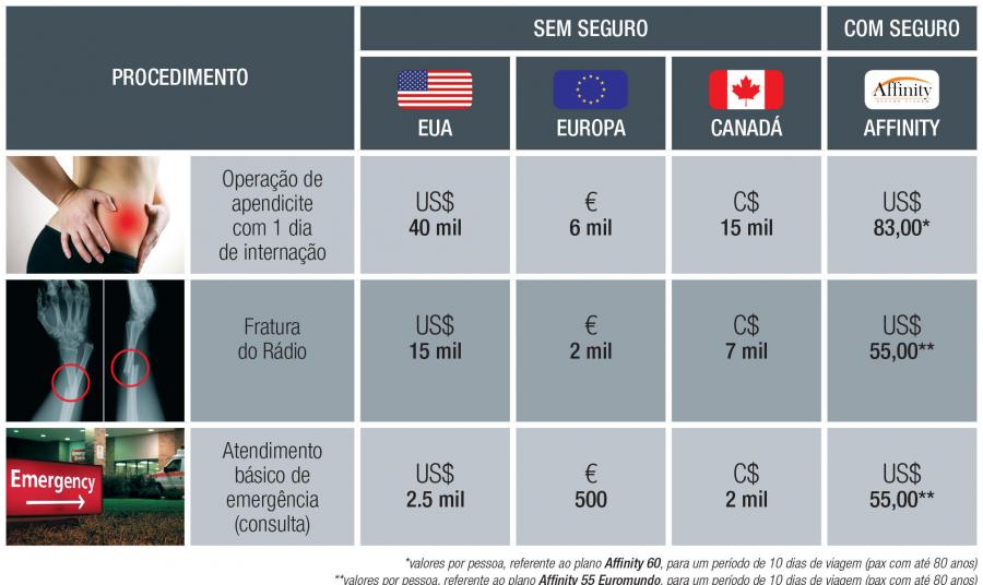 - Valores de procedimentos no exterior chegam a ser de 5 a 100 vezes maiores que uma apólice de seguro viagem