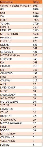 Das montadoras com maior volume veículos sinistrados, a campeã foi a GM, somando 8.090 ocorrências no período, seguida pela Fiat, com 6.422, Volkswagen, com 6.096 e pela Ford, que contabilizou 3.905 de processos.