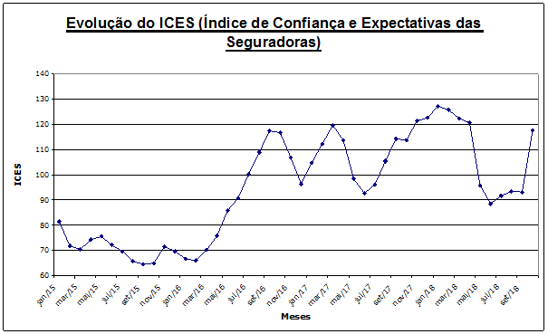 Em outubro, o ICES subiu 26%, indo agora para um patamar pouco acima de 115 pontos. Esse é o maior valor, desde abril desse ano. Lembrando que, em maio, houve a greve dos caminhoneiros.
