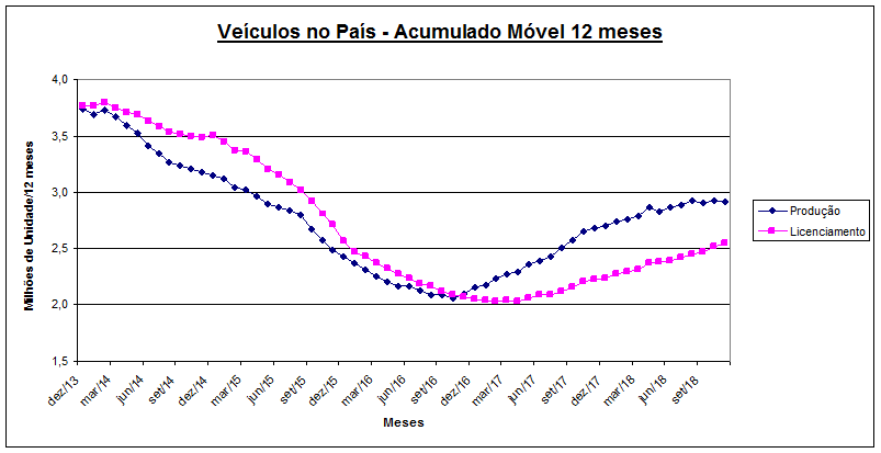 · A partir do início de 2017, passou a haver alguma recuperação, ainda que tímida. Em destaque, a produção de veículos saiu na frente, beneficiada pela exportação, havendo então o descolamento das curvas. Nesse momento, final de 2018, a produção e o licenciamento se situam, respectivamente, em 3,0 milhões e 2,5 milhões de unidades em 12 meses.
