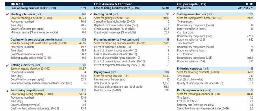 No caso do Brasil, a análise está centrada nas cidades do Rio de Janeiro e de São Paulo. Nesse caso, tomando como referência essas regiões, o país teve melhoras no desenvolvimento de processos “on line”, maiores informações sobre crédito e a implantação da reforma trabalhista.