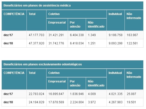 A Agência Nacional de Saúde Suplementar (ANS) divulgou nesta terça-feira (05/02) os dados do setor relativos a dezembro de 2018. Os números foram atualizados e podem ser consultados na Sala de Situação no site da agência. Os dados fornecidos pelas operadoras de planos de saúde mostram estabilidade no número de usuários. O setor encerrou o ano de 2018 com 47.377.920 beneficiários de planos médico-hospitalares e 24.194.829 beneficiários de planos exclusivamente odontológicos.