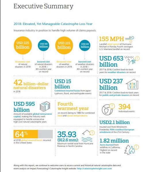 Abaixo, temos o texto da empresa de consultoria e corretagem Aon, com dados de 2018. Escolhemos esse, pois há um quadro resumo bem montado com as informações mais relevantes. Por exemplo, 64% das perdas seguradas com catástrofes vêm dos EUA.
